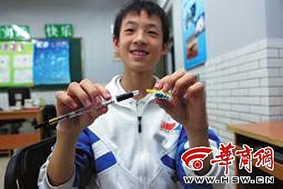 孙玮泽是高新一中初中校区初三学生。身着校服的他,虽然一脸稚气,个头瘦小,但却是学校人人皆知的“小发明家”。他发明的“旅行牙刷”是在空心笔杆上装上牙刷头,底部有一个旋钮。“把牙膏装进笔杆里,转下旋钮,就能把牙膏推到刷头上。”孙玮泽边演示边说,这样旅行时,就不用带一大管牙膏了,换牙刷时也只换刷头就行,比较环保。