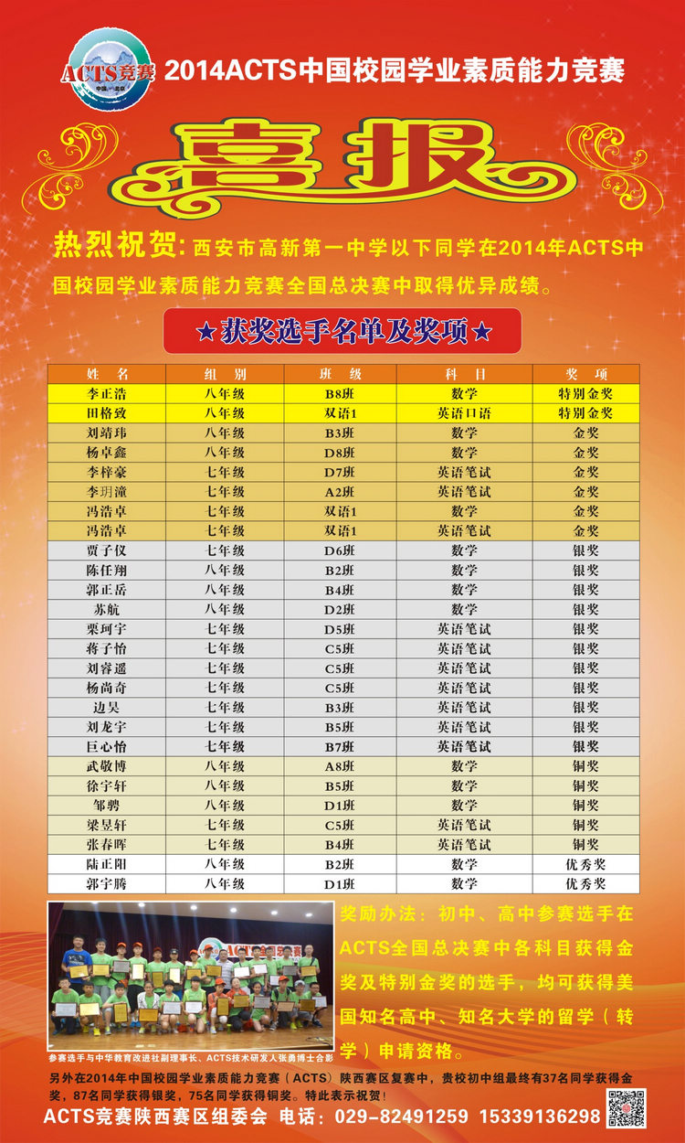 据悉,本次ACTS全国决赛,高新一中初中校区数学学科有13人、英语学科有12人、英语口语有1人参加了全国总决赛,他们组成了颇具实力的陕西代表队主体。