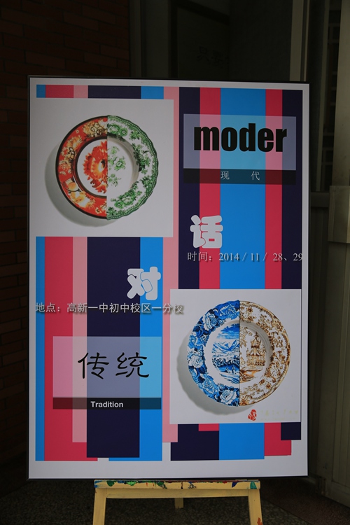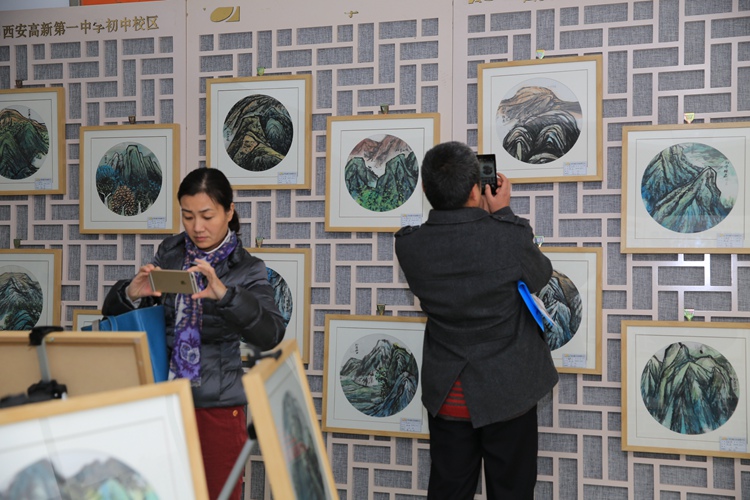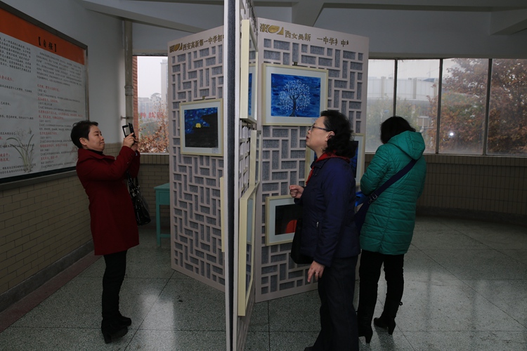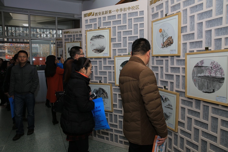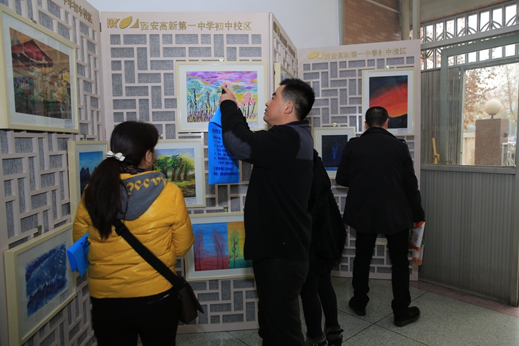 此次展览共展出学生作品212幅,这些作品全部来自学生每周一次的美术课堂。因为展出场地有限,这只是一分校极少一部分作品。从开学初,美术组全体老师在学校统一部署安排下,整合教材内容,结合初二学生特点和知识结构,深挖美术课堂教学模式。最终选定《传统对话现代》这个主题。他既包含了中国传统国粹:中国画,有体现初中学生的色彩创作激情。学生可以选用不同的纸张、颜料,用不同的绘画语言,体现共同的审美、情趣、意境。一点、一线、一树、一石、一个图案、一种色彩都体现的是西安高新一中初中校区学生的艺术素养。美术课我们培养的不是画家、更不是艺术家。而是培养具有一定的人文素养,了解人类大脑思维的丰富性,对高尚的美、经典的美、生活中的美能有体验感知的能力,对于美术的基本语言(手绘线条图像、各种色彩的搭配、绘画、雕塑、建筑、工艺设计等)掌握应用。我想这次展览已经能够说明一切了。