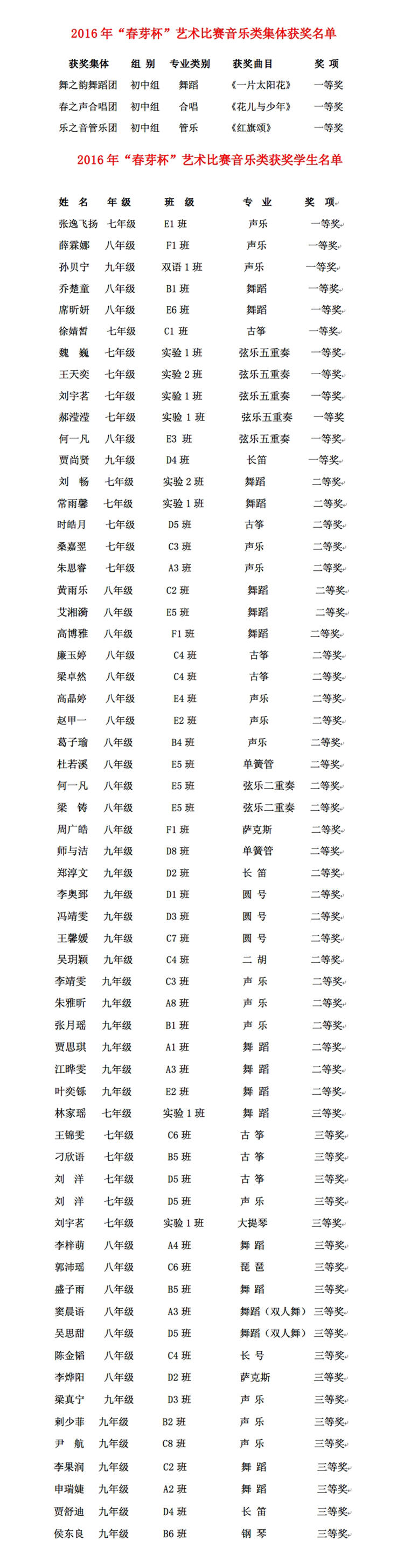在集体项目中,我校舞之韵舞蹈团的舞蹈《一片太阳花》喜获初中组一等奖,这是继去年获得二等奖后,今年又以一等奖的第一名位居榜首;春之声合唱团的合唱《花儿与少年》喜获初中组一等奖,这也是连续两年蝉联合唱类集体项目一等奖。而我校管乐团今年首次参加“春芽杯”比赛,在本届参与乐队历年最多,强手如林的情况下,以一曲《红旗颂》获得了初中组管乐类集体项目二等奖的好成绩。