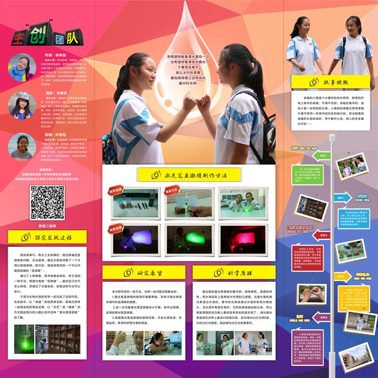 心得体会:作为导演,要组织、分工、与老师同学协商等,创作的过程非常累。但当我们踏上了这条创作之路后,看着我们仨和老师的心血一点点凝聚成这七分钟短片时,那些困难,甚至想要放弃的念头都消散了。相反,带给我们更多的是团结和科学探究的快乐。