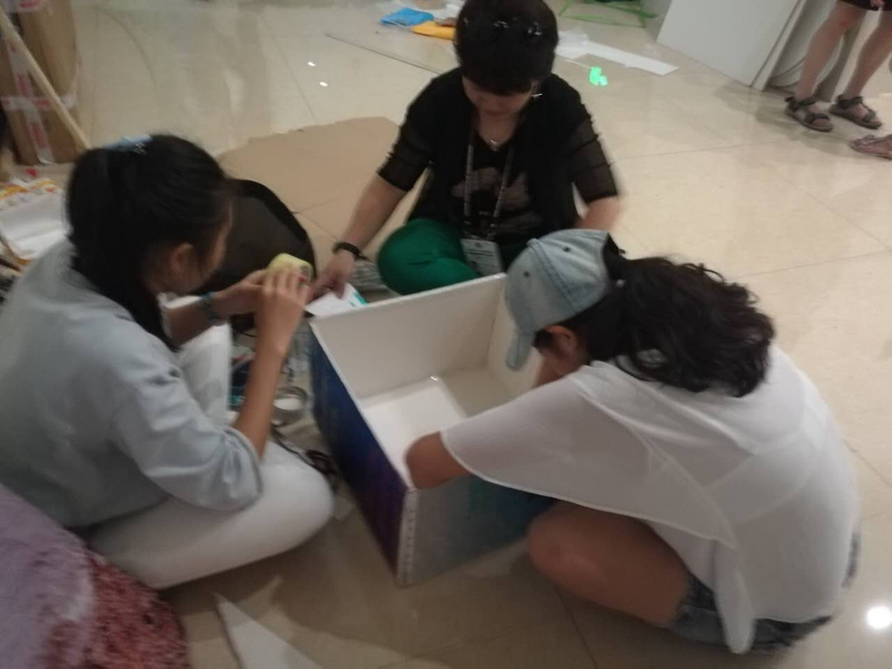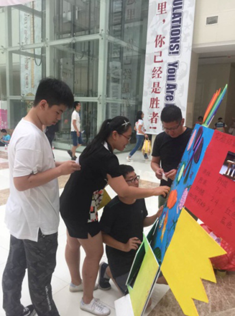 任晓哲、孙丽、胡圆、隋洁老师在指导学生做展板