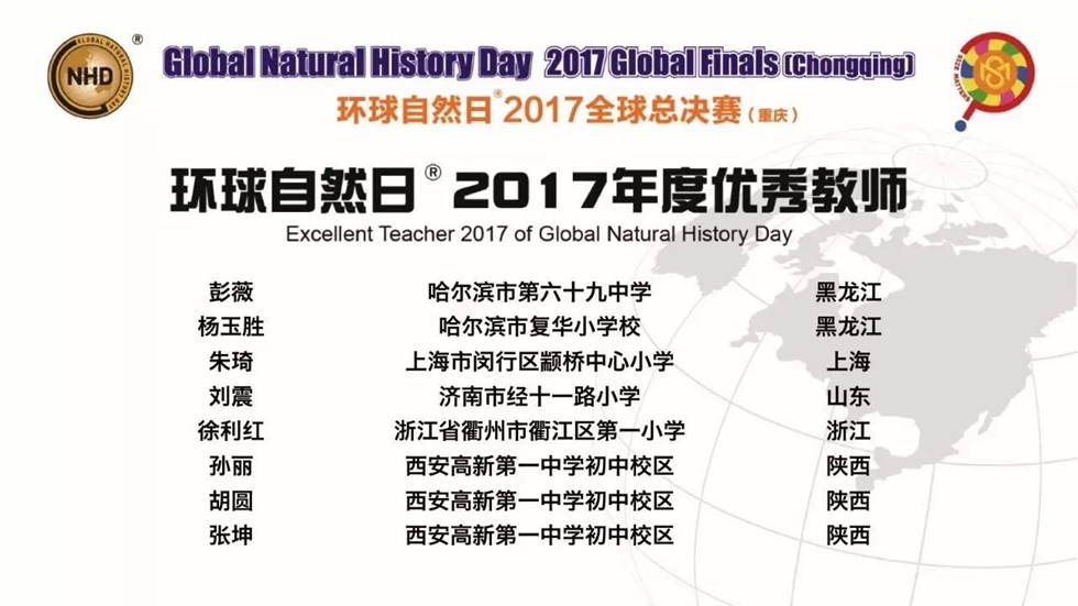 孙丽、胡圆、张坤老师被评为环球自然日2017年度优秀教师,全球总决赛中仅评选出8位,我校即占3位,远高于其他学校。