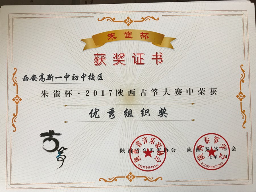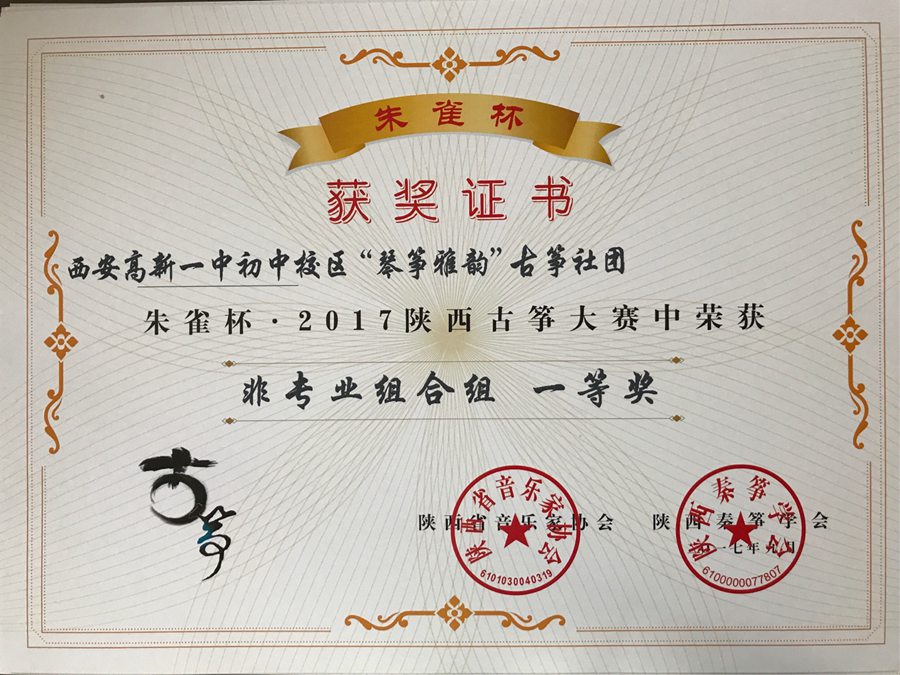 高新一中初中校区琴筝雅韵古筝社团于2017年七月十六号参加陕西省朱雀杯古筝专业大赛,我校社团24名学生一曲陕西风格的古筝三声部作品《百花引》荣获团体演奏一等奖。陕西省朱雀杯是全省的古筝大赛,这次大赛我校古筝社团全体学生首次参加这样的专业级别的比赛,我校学生赛出了自己的风格和水平,赛出了高新一中初中校区学子的风采!受到了专家们的一致好评!