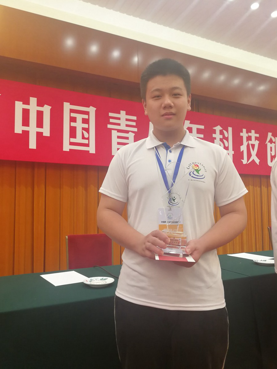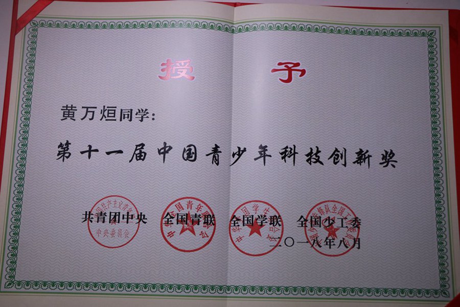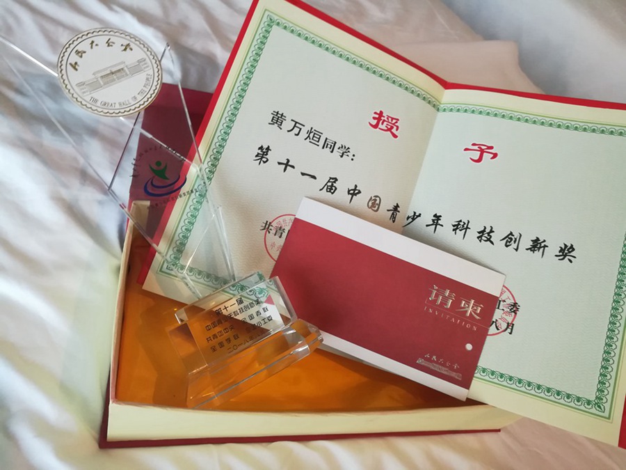黄万烜经过团中央遴选以及公示,脱颖而出,被授予第十一届中国青少年科技创新奖,他是全国11位获得该奖项的中学生之一,也是我省唯一一位获此殊荣的初中生。