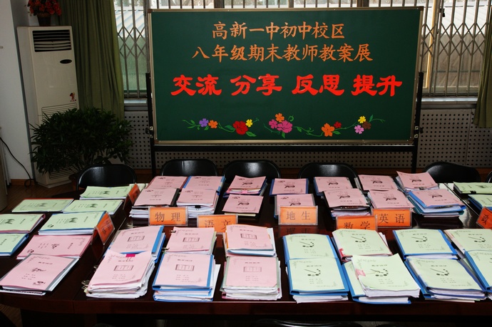 展室内老师们的教案整齐有序的摆放在展台上,一本本厚厚的、沉甸甸的教案见证了老师们辛勤、认真、精心钻研教材的身影,“台上十分钟,台下十年功”精彩课堂的背后倾注了老师多少的心血与汗水。