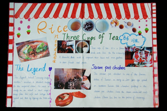 英语探究:同学们通过阅读提升自己的英语水平,阅读英文小说《Treasure Island》并做批注,观赏英文电影、摘录精美台词;在春节期间走亲访友,品尝美味,并与朋友们一起分享食谱。拍摄了一些美味食品制作过程的照片并进行英语文字说明。进行综合拓展,同学们在娱乐中学习英语。