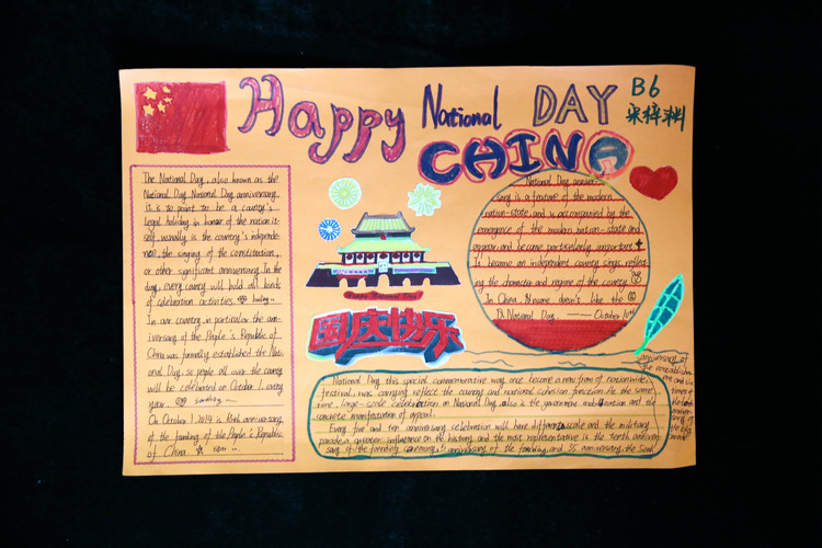 同学们还观赏经典的英文电影,选取最喜欢的英文电影介绍并制作小报;他们查阅资料选取最感兴趣的主题制作有关国庆节的英语手抄报,从国庆节的来历,以及国庆节的庆祝活动等多个角度选取主题,通过英语小报抒发了学生浓浓的爱国情怀—我的中国心,个性化的版面,手写、手绘、图文并茂。