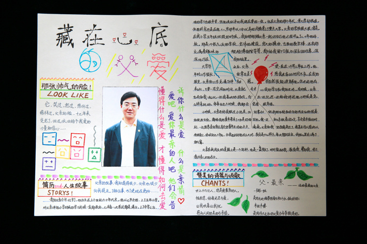 还有的同学制作了《我心中的父亲》小册子,他们从不同的角度描绘父亲,如“藏在心底的父爱”“父亲—最亲”“我的万能老爸”“最温情的瞬间”“聆听心底的声音”等等。在活动中,孩子们走近了父亲,带着他们的爱意,携着他们的感恩,用他们细腻的笔触,去抒写那熟悉而又陌生,清晰而又模糊的父亲。体会如山一样的父爱,字里行间流淌着对父亲浓浓的爱,父亲给孩子的留言板更让人为之感动,父子之爱在笔尖流淌,爱在父子间传递、交融,这是真情的流露,爱的升华!