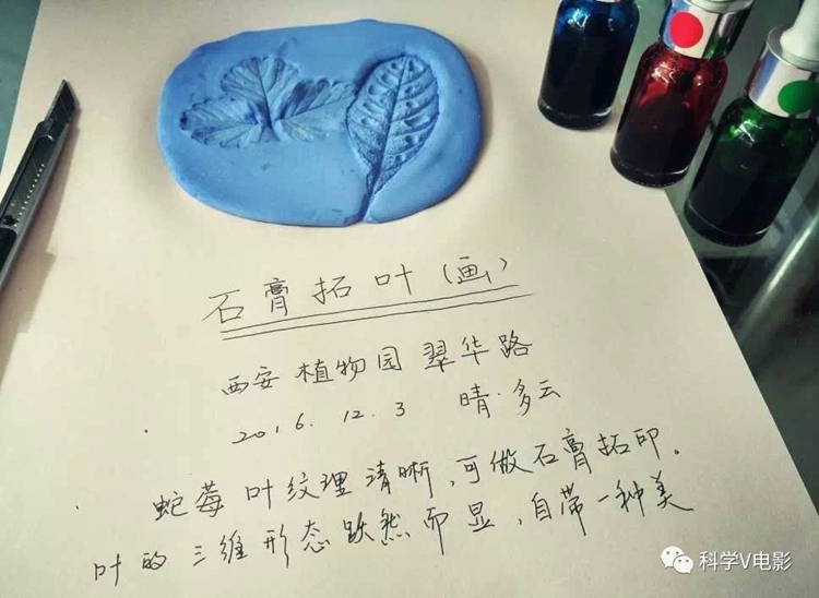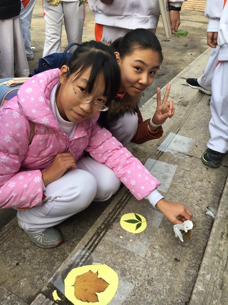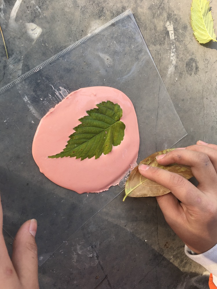 探究活动结束后,学生们还意犹未尽,于是在自然导师的带领下,孩子们又兴奋的做起了植物叶脉化石。他们利用石膏将叶片的形状、叶脉制作成拓片,留住了它们的美丽,也在自己的心里留住了植物学所带来的快乐。