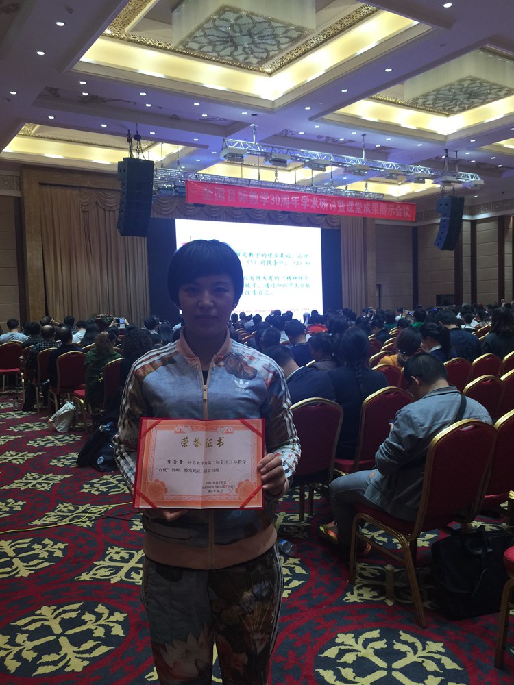 2016年10月20、21、22日,全国目标教学30周年学术研讨暨课堂展示会议在山东泰安隆重召开。我校英语教师李蕾蕾老师脱颖而出,荣获全国目标教学大赛课堂评优课特等奖(一等奖第一名)并获得“全国百优教师”称号。