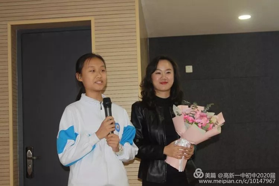 八年级创新班杨依椤同学代表全体同学向徐老师献上鲜花。