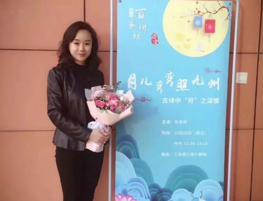 她说“现在虽是正午,空中无月。但在徐老师的讲述中,我们似乎能看到月‘夜夜减清辉’的清冷,‘人生代代无穷已’的永恒。感谢徐老师,为我们讲述如此多姿多彩的月,谢谢。”