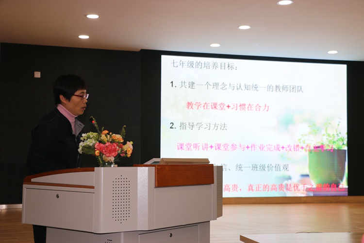 她告诉大家,七年级E6班主要从三个方面进行班级管理和教育:1、共建一个理念与认知统一的教师团队。即教学在课堂+习惯在合力。2、指导学习方法。即课堂听讲+课堂参与+作业完成+改错+自主学习。3、建立班级自信、统一班级价值观。即优于别人并不高贵,真正的高贵是优于之前的自己。