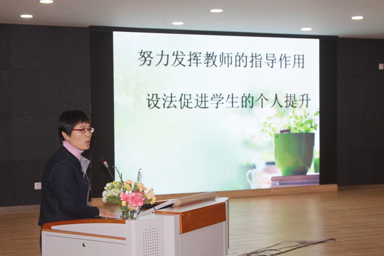 会议的第二项,由八年级级部蹲点德育副主任雷瑛老师结合本班E6班的成功教育教学经验,对全体教师进行了题为“努力发挥教师的指导作用 设法促进学生的个人提升”培训报告。