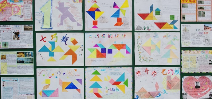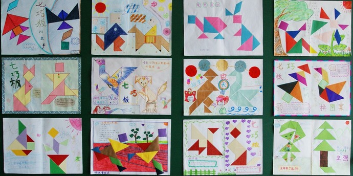 数学探究让同学们到生活中学数学,在生活中用数学,同学们用七巧板制作出了无数美妙的图案,一只猫、几款狗、一间屋、一个人即可说出一串串美妙动人的故事……手抄数学小报,不仅能使孩子们增长数学知识,陶冶情操,而且能给人一种美的艺术享受,真可谓“神奇七巧显智慧,精美小报展才华”。