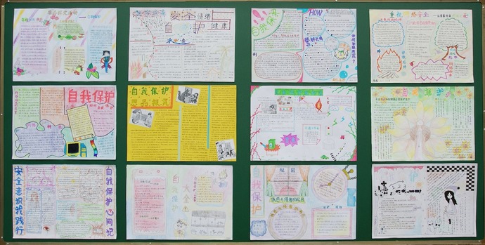思品探究作业针对中学生这个年龄阶段,面对身边的不良诱惑和侵害,同学们深入调查,制作出了版面活泼有创意、内容实在的自我保护小报。