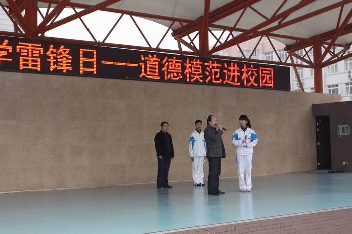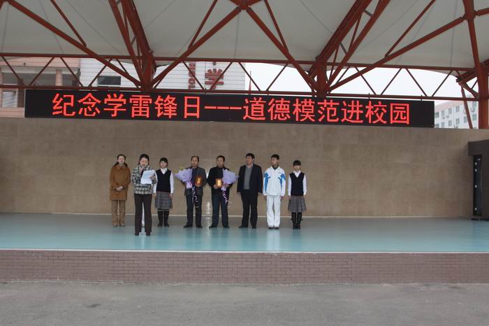 高新一中初中校区特举办纪念学习雷锋日——道德模范进校园的活动。他们请来英雄的哥被称为“双臂哥”的孟谋林师傅和捡到22万交还失主的曹玉长师傅。在活动中两位学生分别与的哥互动、了解他们内心的想法。老师代表还为两位师傅送上了精心创作的颁奖词。高新一中校区还聘请两位的哥为校外辅导员,并给他们送上了鲜花。活动最后在学生们“我的爱心会温暖他人,我的言行会影响他人,我的服务会感动他人,我的尊重会鼓舞他人”的宣誓中落下帷幕。