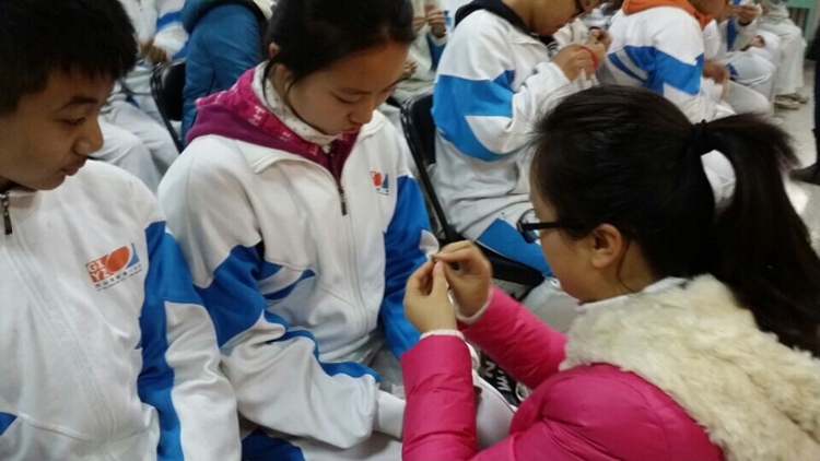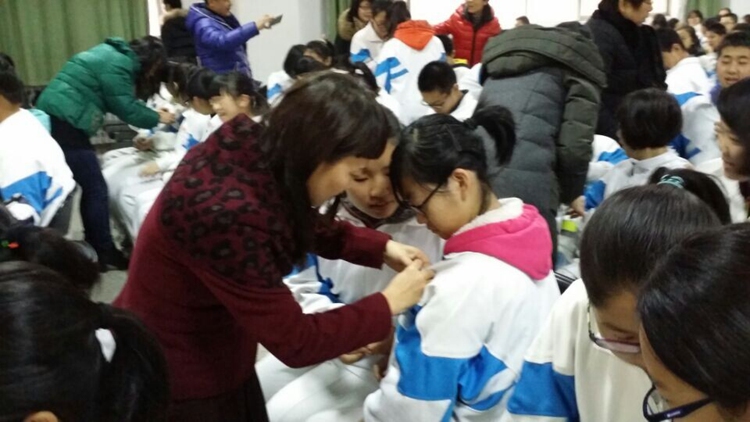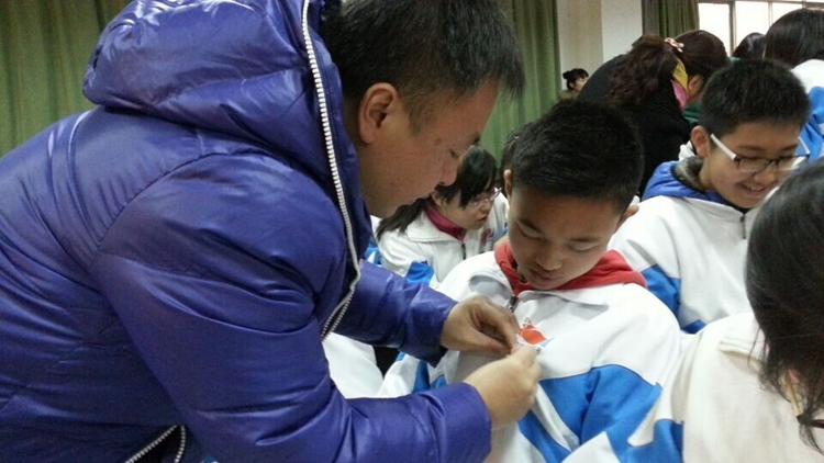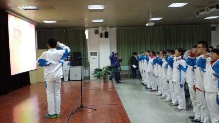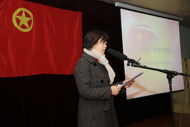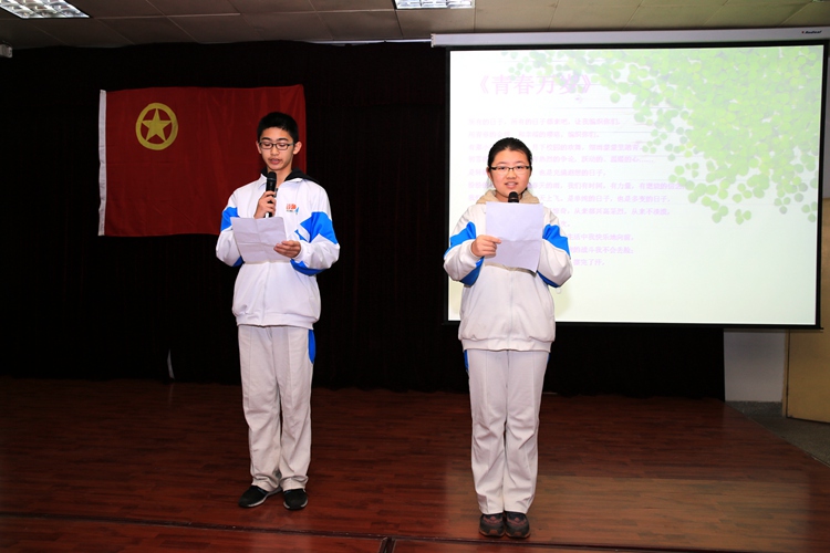 上午10点整,主持人B3班吴杜海宣布入团宣誓仪式开始,首先由团委赵治博老师宣布2016届新团员名单;然后全体团员在领誓人的带领下,面向团旗举起右拳,庄严宣誓:我志愿加入中国共产主义青年团,坚决拥护中国共产党的领导,……为共产事业而奋斗。伴随着“光荣啊,中国共青团”的乐曲声,32位班主任满怀喜悦的为新团员们佩戴了团徽,一句句“谢谢老师”,一次次充满感激的凝视,刹那间将他们融在了一起。D7班陈雨田代表全体新团员向团组织、学校领导及全体师生表达了他们的决心:用自己的实际行动做一名优秀的共青团员。李红霞副校长给新团员及学生代表送上了殷切的期望:希望同学们能够做一个追求梦想的人,把自己的梦想同“中国梦”紧紧相连;希望他们把所有的时间和精力投入到每一天的努力之中,成就最美好、最有挑战性的未来;也希望他们勇于担当,无悔于青春年华。在舒缓的钢琴伴奏中, B4班张琦瑄和B7班张皓博深情朗诵了王蒙的诗歌《青春万岁》,完美阐释了李校长提到的:什么是值得每一个人珍视的青葱岁月。最后,在全体老师和学生代表的掌声中,2016届首批团员入团宣誓仪式结束。