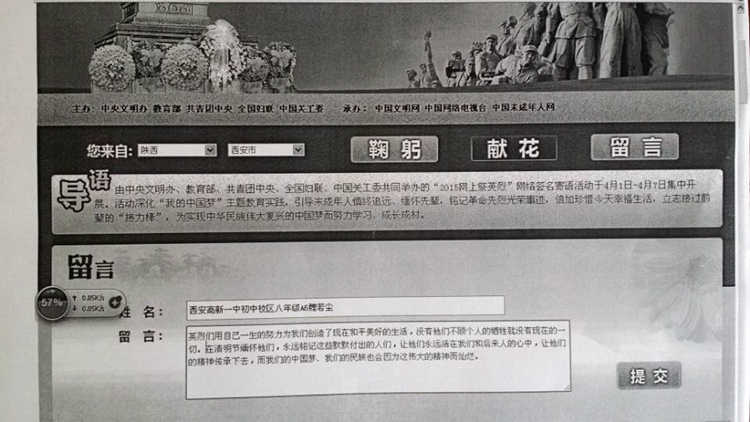 1、网上祭奠。通过网络向先贤烈士们献上鲜花、鞠躬,在留言栏上留言,表达自己的缅怀之情。同学们踊跃参与本次活动,我校共有4000余名学生在网上献了花,留了言。学校还选出部分优秀寄语进行了存档。