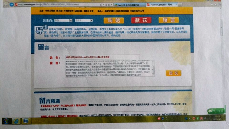 在中华民族的传统节日——清明节到来之际, 为认真落实中央文明办、教育部、共青团中央、全国妇联、中国关工委《关于组织未成年人开展“网上祭英烈”活动的通知》要求,充分挖掘运用重要民族传统节日文化内涵,对未成年人进行生动形象的“中国梦”学习教育,缅怀革命先烈的英雄事迹,继承革命烈士的光荣传统,我校广大学生在学校的倡议下,于清明节日期间积极登陆中国文明网和央视网网站,参与“清明网上祭英烈”活动。现对活动情况总结如下: