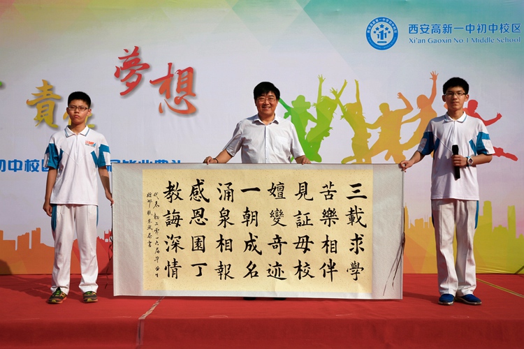 一句贺词,浓缩了对母校的祝福。为了感谢母校的培育之恩,九年级毕业班的同学们纷纷为母校写下赠言,王校长代表学校接过了同学们的毕业赠言“三载求学 苦乐相伴 见证母校 嬗变奇迹 一朝成名 涌泉相报 感恩园丁 教诲深情”,短短的32个字代表了所有毕业生对母校的感恩与祝愿。