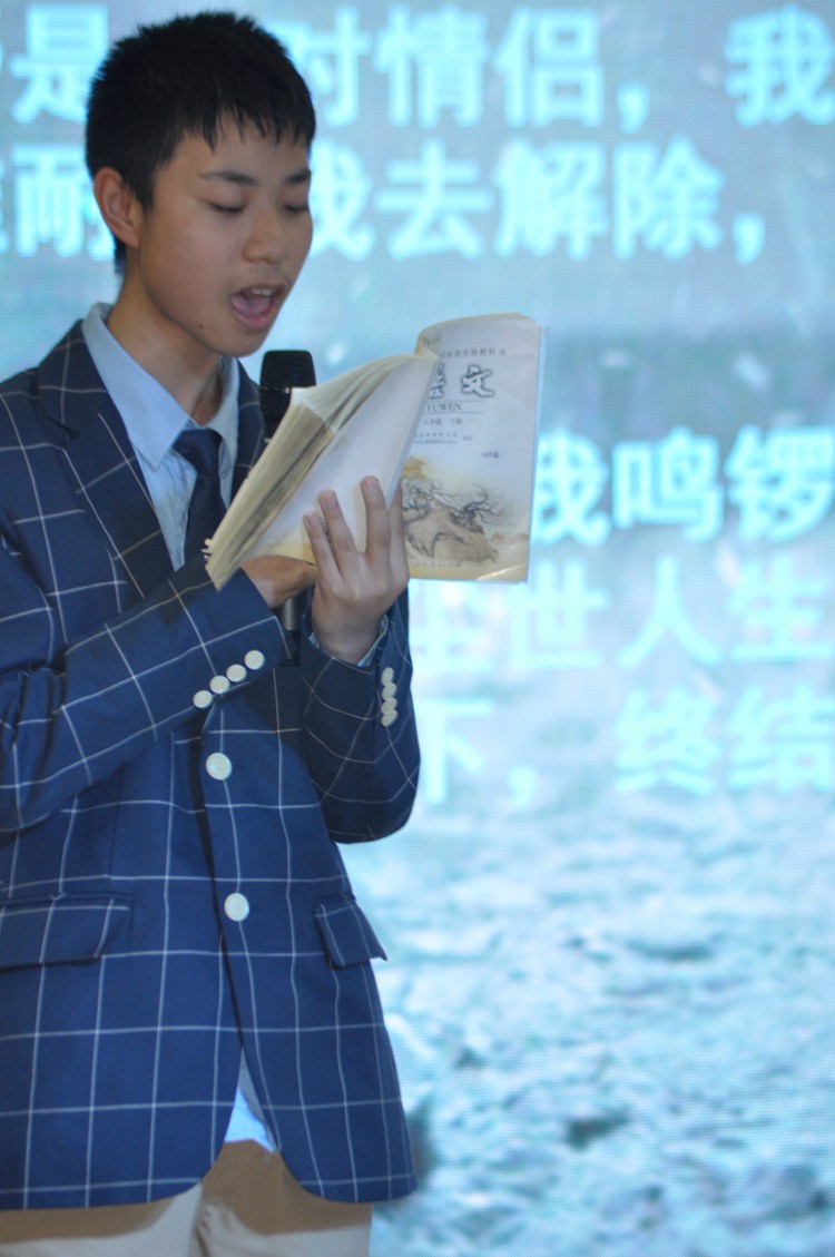 班主任李春岭老师例行课前的“三分钟演讲”为这次朗读者活动做了绝妙的热场,把活动推向了第一个高潮。之后,主持人登台亮相,用优美的语言开场,也赢得了阵阵掌声。