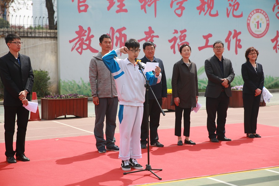 开幕式上,七年级级部主管领导张颖校长助理向全体师生介绍了我校足球联赛的活动主旨,她说,“我校始终坚持‘让每一位学生健康、快乐成长’的教育理念,全面贯彻党的教育方针,全面提高学生各方面的素质。近三年,我们把校园足球这一活动充实到了阳光体育活动当中,成立了校园足球社团和校园足球队,活动取得初步的成效。”还给大家介绍了我校的足球之缘,“2017年7月5日习大大与德国总理共同观看中德青少年足球队友谊赛,我校2018届足球明星贺腾飞是中德青少年足球队友谊赛选中的20名队员中唯一一名陕西籍代表队员。2017年8月21日世界足球先生路易斯·菲戈造访高新一中初中校区,和小球员们一同走进足球场。特别是前两天我校足球队三名队员代表陕西参加全国青少年五人制足球大赛获得冠军,更是让我们看到了足球未来的希望。”最后她代表学校领导向全体同学发出了热情的倡议,“希望各位运动员珍惜这一机会,发扬努力拼搏、团结协作的体育精神,赛出友谊,赛出成绩,赛出风格,赛出精神。也希望同学们以此次活动为契机热爱足球运动,积极投身到足球运动中来!”