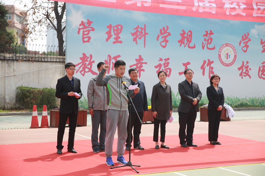 接下来,足球运动员D3班赵子杨同学代表全体足球队员宣誓:服从领导,遵守纪律,尊重裁判,尊重对手,比赛中做到:胜不骄,败不馁,以饱满热情积极参加本届比赛。