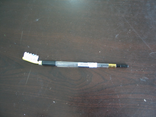 他发明的旅行牙刷,包括空心透明杆和可换刷头,可换塑料牙刷头有一个防滑连接口,用于插在透明空心杆前端,并可以旋转,牙刷头空心可以输送牙膏,两层有圆孔塑料刷头,转动到杆侧面,两孔对上,可以挤出牙膏,转动到正面,两孔错开防止多挤牙膏和水倒流,刷毛中间有一个空心软管用于输送牙膏,塑料空心杆中装牙膏,杆后插入旋钮可推进牙膏,拔下旋钮,可以挤进牙膏到空心管,方便旅行,节约刷杆材料,只需更换刷头,刷杆可以重复使用。