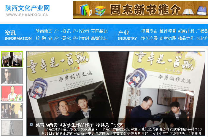 十四家省市新闻媒体10月19日上午对高新一中初三学生李勇剑的作品集《童年是一首歌》出版并获得莫言作序和赠诗进行了报道,电视媒体播出时间和视频网址为: