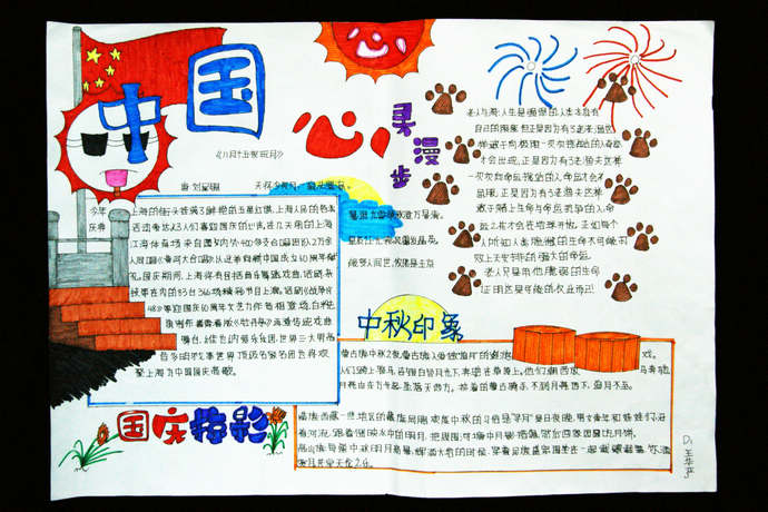 语文探究小报:同学们利用国庆长假,配合我校“第四届校园读书节”活动,和家长一起开展亲子读书活动,办出了以“中·国·心”为标题的精美小报, “中秋印象”“国庆掠影”“心灵漫步” 板块清晰,内容充实、情感真挚。