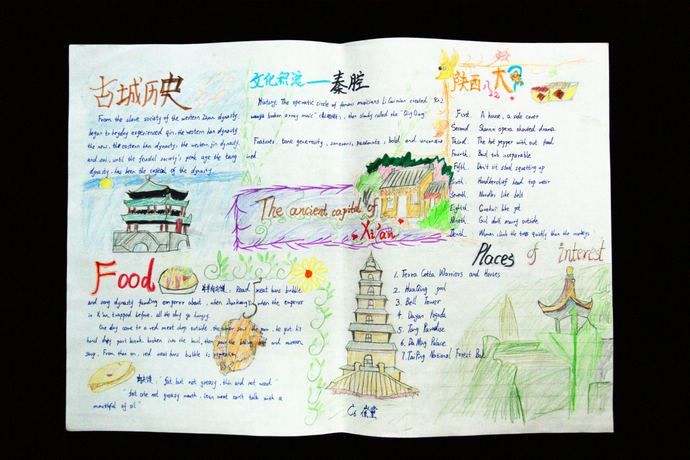 英语探究小报,同学们以记录假期参观西安一些名胜古迹的经历、见闻为主要内容,使学生亲身感受到了古城西安的历史和浓厚文化,手写稿“西安趣事”表达了小作者对古城西安的浓厚感情,图文并茂,内容丰富多彩。背面附有学生自我评价和家长、老师激励性的综合评价。
