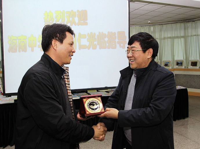 王凤进校长代表我校向海南中学党委书记赠送纪念品