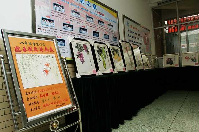 诗人见到自然之美时,会吟咏出“两只黄鹂鸣翠柳,一行白鹭上青天”的绝句;摄影师见到自然之美时,会轻按快门,“咔嚓”一声捕捉住美妙的瞬间。而我们,八年级的小画家们,在李义水、李钦老师的辅导下,舞动灵秀画笔,挥洒丹墨神韵,创作出了一幅幅充满自然之趣的花鸟画。作品中,有傲骨苍竹,清丽幽兰,有娇艳雍容牡丹,淡雅隐逸秋菊,还有鲜活的游鱼、叽喳的麻雀、嗡嗡的蜜蜂,美哉,美哉。