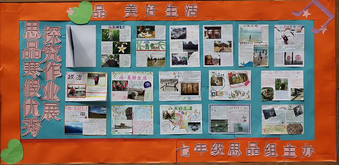 在刚刚过去的寒假中,七年级的同学们在欢度春节的同时完成了语、数、外、政、史、地、生七门学科的寒假探究作业。学生们认真阅读高尔基的《童年》这部优秀的文学经典,勾画“精彩语句”;点评“故事情节”;注评“我的感受”。 他们“记春联,赏短信” “做年饭”“”“咏佳节”,利用寒假生活体验、感受我国“年”文化。在注重学习书本知识的同时,同学们也努力的在生活中体会着数学的奥妙,在逛逛拍拍、比比算算中“精打细算”, 收获感悟。孩子们唱着英语歌曲,看着英语电影,读着英语读物,办着英语小报,徜徉在学习英语的海洋中;在寒假里学生们通过电视、网络、报刊杂志等媒体,搜集空气污染指数数值,了解雾霾天气的成因,《十面“霾”伏我破解,低碳生活我践行》,关注身边的大气环境,思考着这样沉重的话题:做为一名中学生,改善空气质量我们能做些什么?同时了解到我们身边的一切事物,从居住的乡村或社区到就读的学校、生活的家庭,衣食住行方方面面,都经历了发生、发展、演变的过程,“历史”就在我们身边,需要我们进行调查探究。同学们在探究科学的同时,记录着一颗颗白菜开花的日子,“育花手册”让所有看过的人都怦然心动,原来白菜这么普通的东西也能绽放出如此的美丽和精彩。