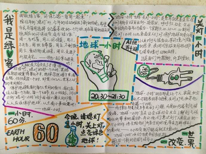 “地球一小时”是一项全球性公益活动,在每年3月最后一周的周六20:30—21:30自愿关灯一小时,以此来激发人们对保护地球的责任感,以及对气候变化等环境问题的思考。今年“地球一小时”活动主题为:“我做绿v客”,内容除传统的熄灯外,还鼓励大家在七项的环保活动中选一项,并在每周固定的一天坚持开展。