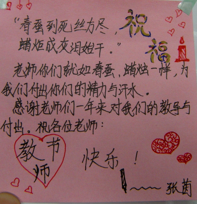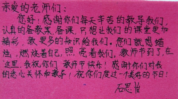“敬爱的老师们:我是一颗绿树,沐浴着智慧的阳光,在您知识的土壤里,茁壮成长。