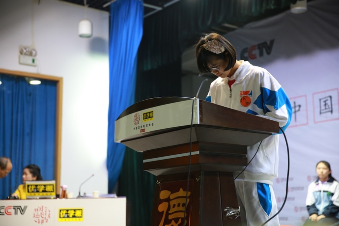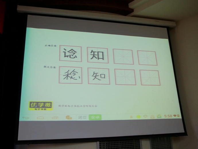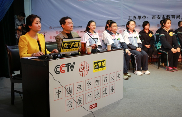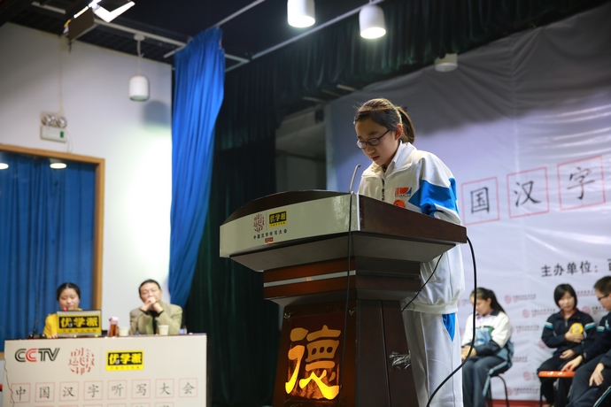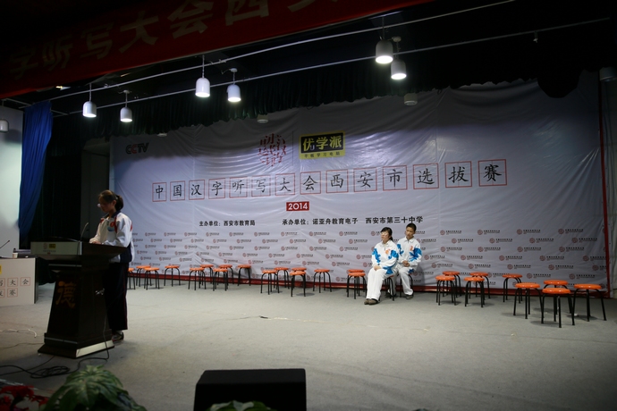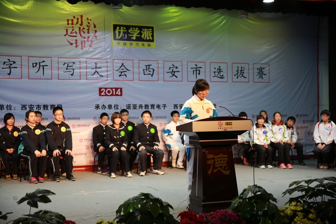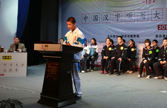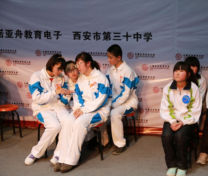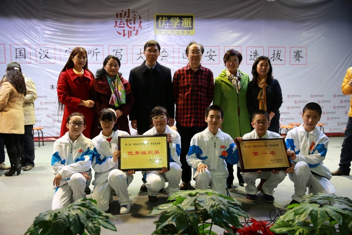 决赛于下午2:30在西安市第三十中准时开始。比赛采用选手逐一上场、出错淘汰的规则进行。每一位选手只要出现一次错误,就会惨遭淘汰,所以场上选手和领队以及指导老师都十分紧张。我校参赛队经过反复考核,决定派出于芷淇、刘柏萱、周艺康、卢玥辰和黄静泊5名同学上场比赛。根据抽签,我校选手每轮比赛第三个出场。指导教师赵文艺安排发挥一向稳健的于芷淇打头阵。第一轮前两个学校的选手都顺利过关,于芷淇不负众望,准确地写出了“睥睨”两字,为我校选手开了个好头。前三轮的比赛可以说是有惊无险,各队的选手都顺利过关。从第四轮开始,主考官逐渐提高了难度,各队开始出现选手被淘汰的现象,我校选手也不例外。比赛渐渐进入白热化状态。我校选手凭借出色的表现坚持到了最后。最后的巅峰对决在我校和长安第一民办中学之间展开。我校场上还有于芷淇和周艺康两名选手,而对方只剩下一名女选手。对方选手首先出场,主考官出题“谂知”,对方选手犹豫再三,将“谂”写成了“稔”。这时只要我校选手能够书写正确,比赛就将终止。周艺康同学深呼了一口气走向答题台,主考官出题“腥膻”。周艺康同学从容地写出了这两个字。评委举起绿色“正确”牌,主考官说到:恭喜你,书写正确!比赛现场一片欢呼雀跃。现场的领导、评委和观众都给我校选手报以雷鸣般的掌声。我们如愿以偿地获得了第一名!