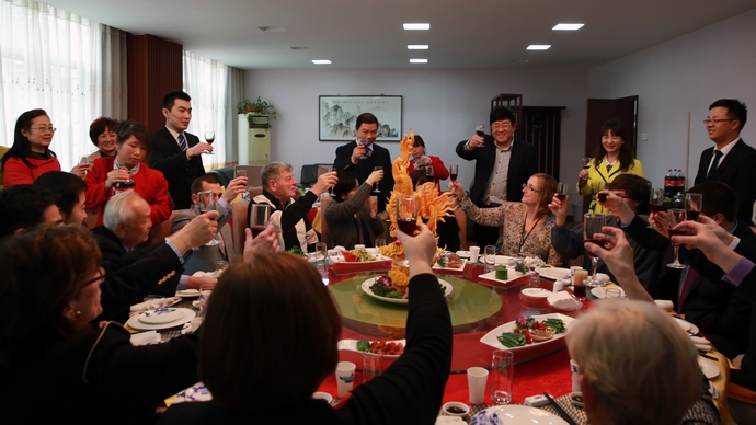 王校长向各位美国校长敬酒表示欢迎