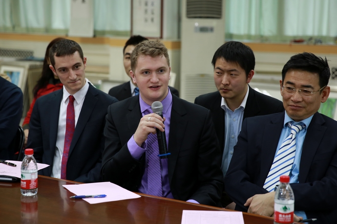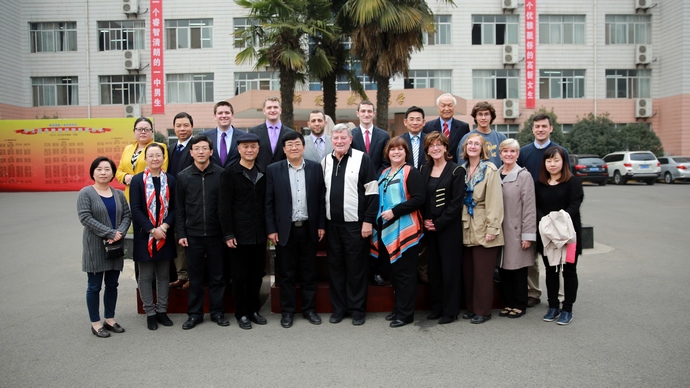 当天下午,美国校长团一行18人(外带随行人员3名)到达我校后,我校王凤进校长热情地接待了来自美国的贵宾,并邀请他们共进午餐以表欢迎。欢迎宴上,我校食堂主厨王振师傅为美国贵宾们准备了色香味俱全的中式名菜和陕西本地名小吃等丰盛的菜肴。美国友人们大开眼界、大饱口福。席间,美国纽约艾欧拉高中校长