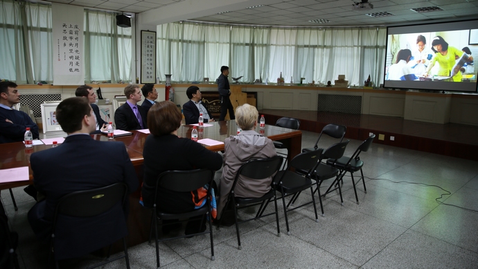 美国友人观看我校宣传片