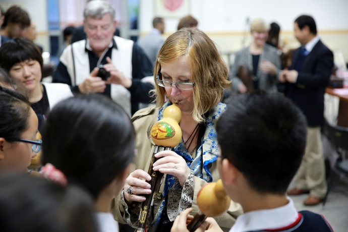 美国友人向学生讨教学吹葫芦丝