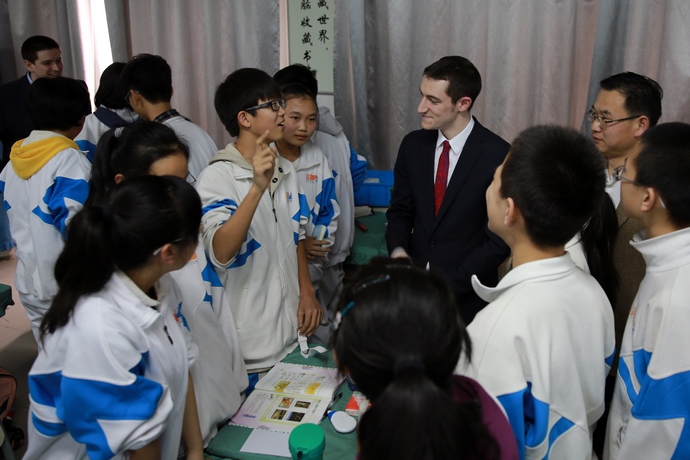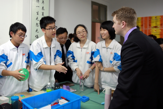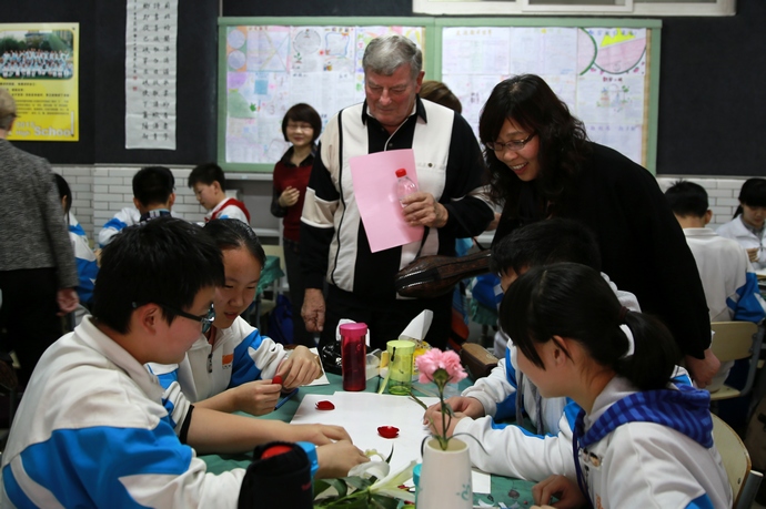 座谈结束后,美国友人们又来到我校八年级双语1、2班的教室里,兴致勃勃地旁听了学生的物理课和生物课。物理课上