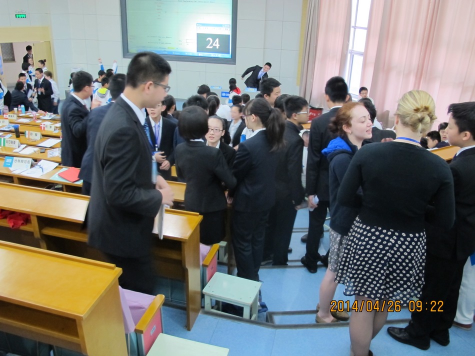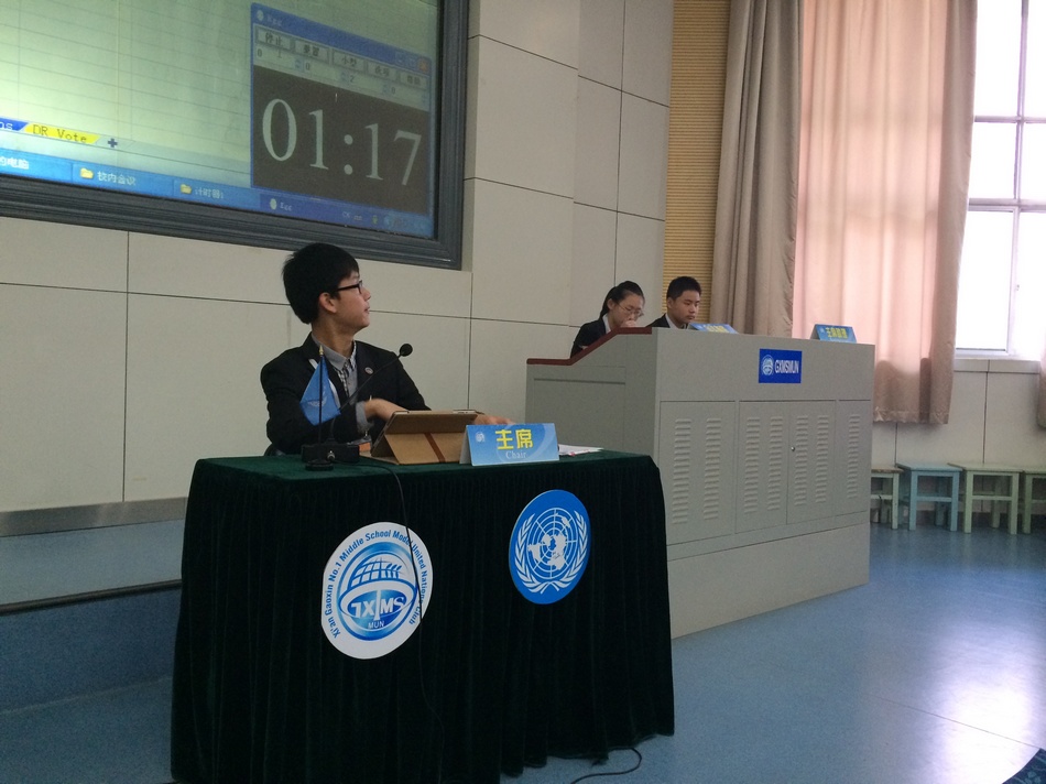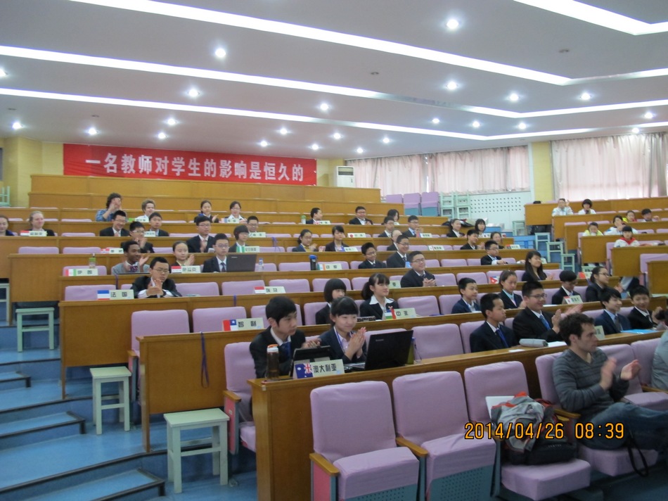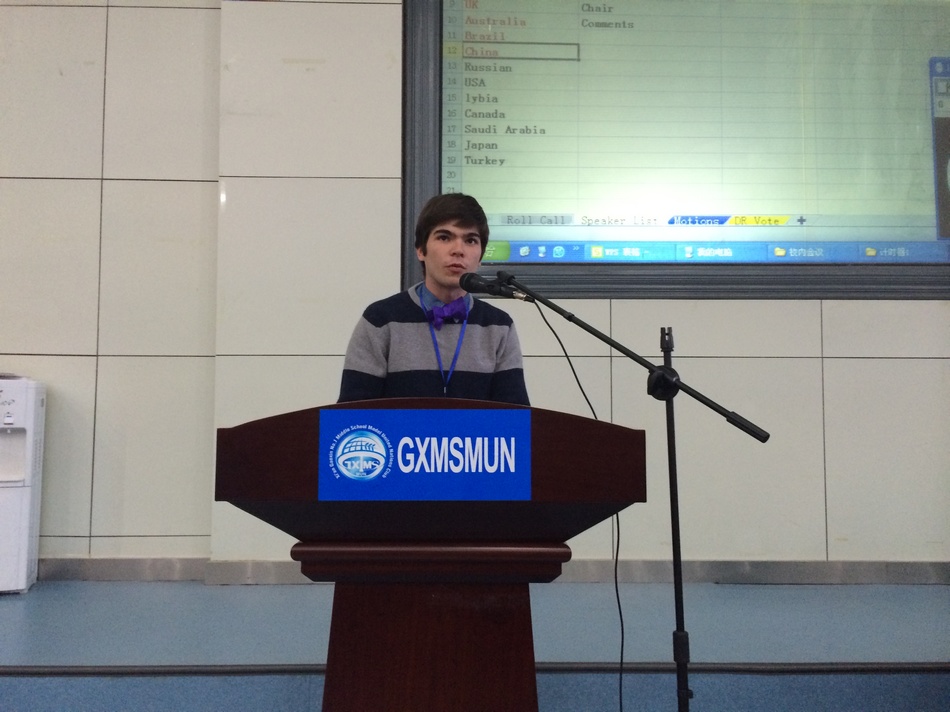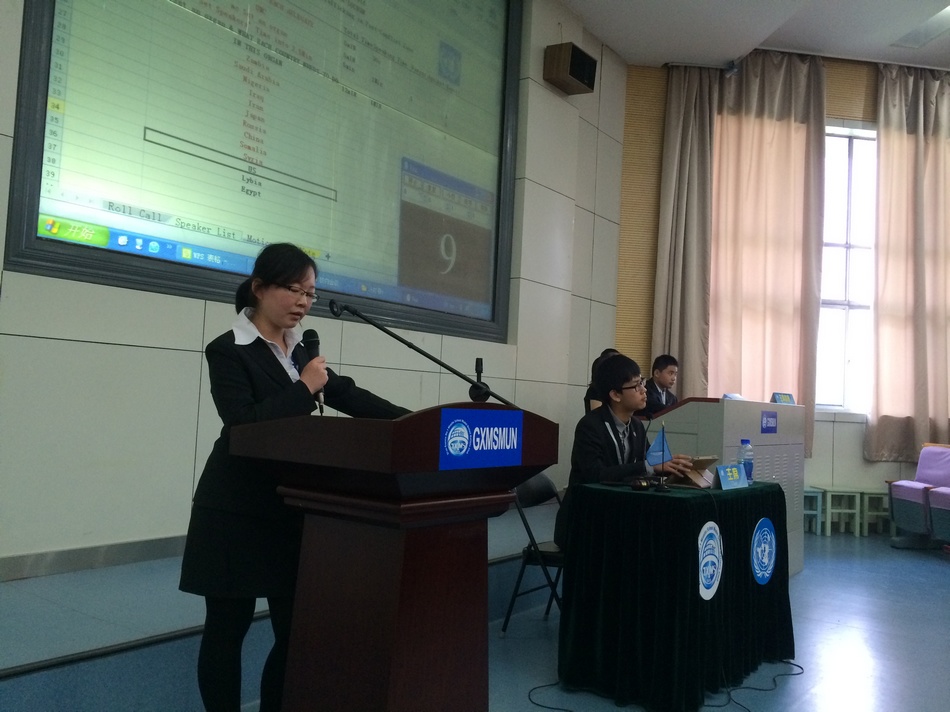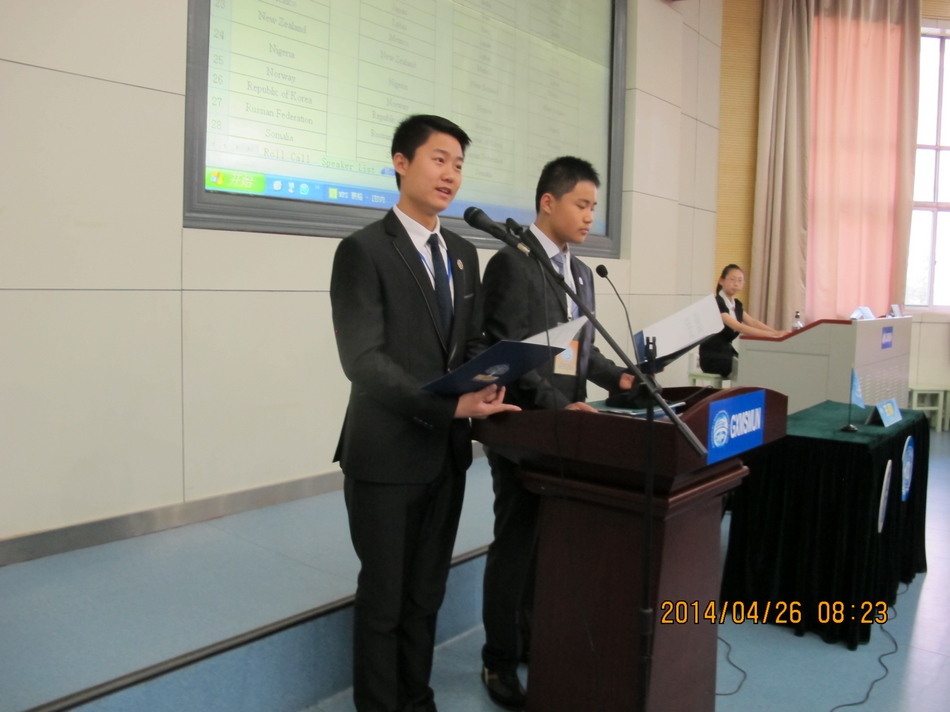 张小英副校长为开幕式做主旨演讲,外事办石德宇老师同步翻译。张校长尽数了在她关注下的我校模联人的成长和进步,并对本次会议中同学们的表现寄予厚望。她热情洋溢、万分鼓舞的讲话,不仅让在场每一位高新学子热血沸腾,更让美国朋友们感受到了高新一中人的热情与深厚的人文素养。紧接着是我校模联社团首任秘书长于北辰同学作为本次GMUN 2014组委会秘书长向所有代表奉上的英文演讲。从阿拉伯之春到乌克兰局势,从种族歧视再到意识形态不同,他古今中外、旁征博引,用流利的语速和气势磅礴的排比句式,激情四射地讲述了模联活动带给每一位“模联人”的快乐、知识、友谊,责任,以及作为一名“模联人”的幸福感。他的致辞征服了在场包括美国学生在内的每一个人。开幕式最后,于秘书长郑重地敲响了手中的主席之棰,宣布会议正式开始!