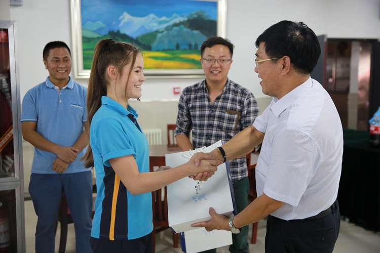 王凤进校长为金思伍德师生赠送我校20周年校庆纪念T恤和画册