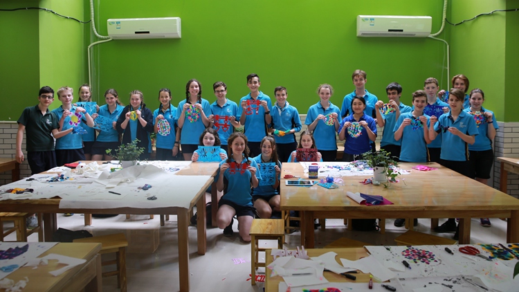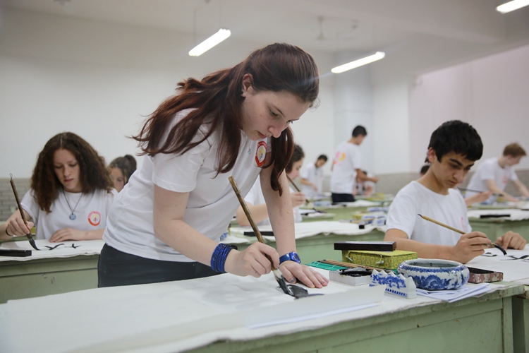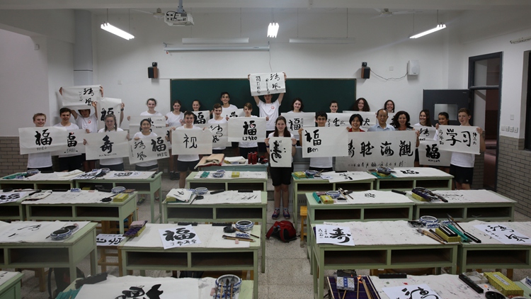 澳洲师生迫不及待换上我校20周年T恤,学习中国书法