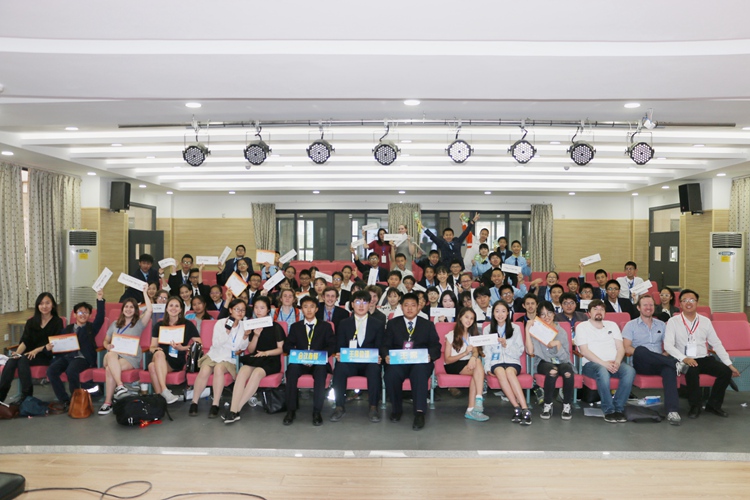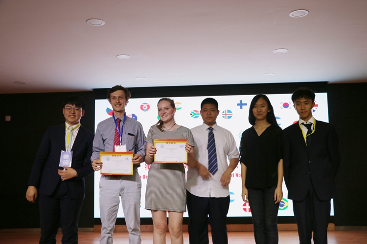 闭幕式上,学生代表白雅乐,会议指导史一南,以及会议主席王培宇,分别进行了闭幕演讲,总结了两天以来从与会国代表,主席团成员,再到大会组委会,以及志愿者的辛勤付出和精彩表现。之后便是万众瞩目的颁奖仪式,三校的模联学生均有不同的斩获:最佳观察国代表由我校7年级学生李沐璟、胡英凯获得;最佳立场文件由来自美国布鲁克兰中学的Olivia和Julia老师,以及西安高新国际学校的James和Yang斩获;荣誉提名则是由我校学生相衍鹏、闫喆、王天宇,布鲁克兰中学的Henry,以及高新国际学校的Jakie&Rachel拿下;值得骄傲的是2项杰出代表均被我校学生白雅乐、陈冯一萱以及刘珍瑜和王昭俨所囊括,他们战胜了众多的国际学生脱颖而出,展现了我校模联学生不凡的实力;来自美国布鲁克兰中学的学生Emliy和Jake用他们在会议中展现出的极强的外交斡旋能力,帮助他们所代表的日本成功地脱离了外交重重困境,当之无愧地获得了此次会议的BD最佳代表称号。最后,在主席王培宇法槌叩响声中,GMUN2017宣告圆满落幕。