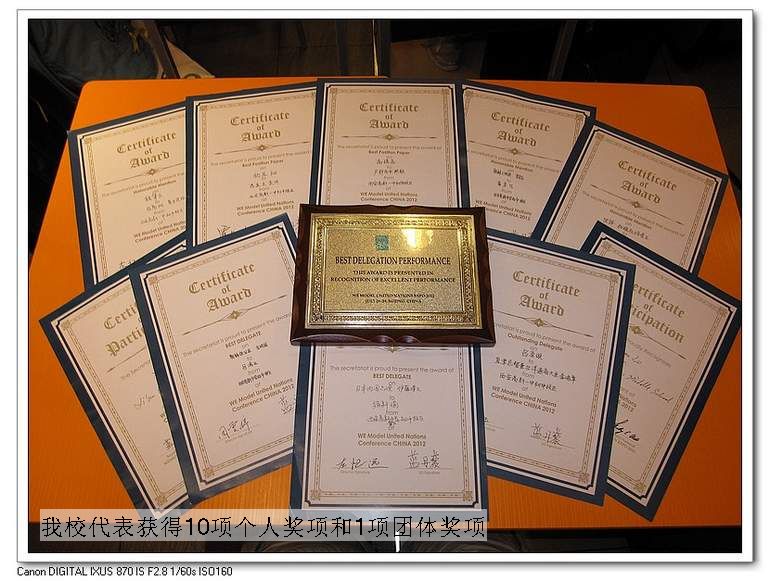 4天模联会议,4个委员会,30名代表共夺得10项个人奖项,1项团体奖项。在亚洲地区规模最大的模联会议WEMUN EXPO 2012的闭幕式上,西安高新一中初中校区代表团的名字响彻全场!震撼全场!