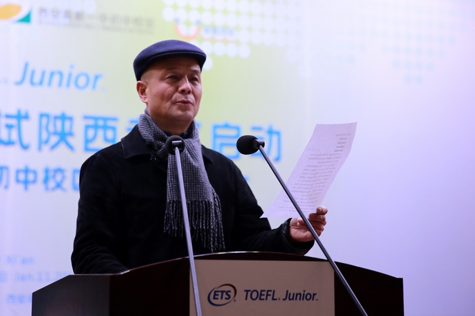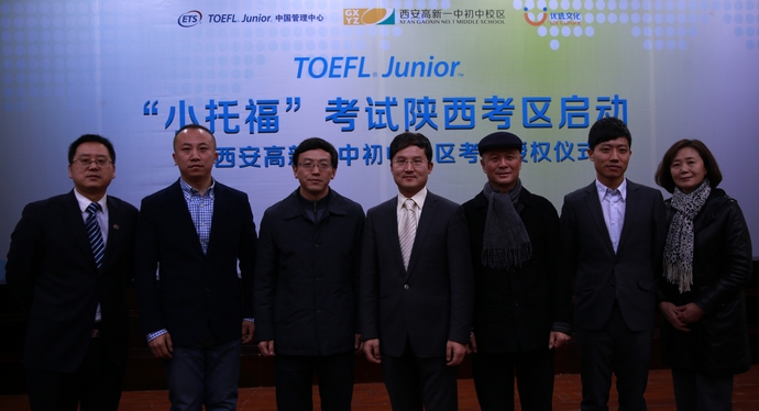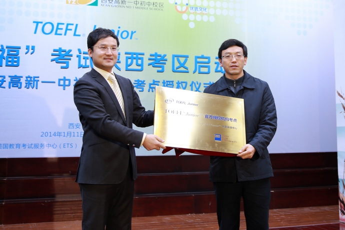 出席仪式的主要嘉宾有:ETS小托福中国管理中心运营总监唐振华先生、ETS小托福中国地区项目经理朱哲先生、ETS小托福官方授权报名机构优选文化代表侯小瑞先生、高新一中初中校区副校长贺三宁、张振斌、校长助理教务主任张颖、校办主任吴永胜等。能够容纳350人左右的多功能厅座无虚席。陕西电视台、华商报、西安晚报、新浪网陕西频道等多家媒体以及300多位学生家长受邀参加授牌仪式。副校长贺三宁代表学校向来宾表示了欢迎并阐述了得到ETS小托福考试正式考点的授权对我校学生的意义。在唐振华先生的介绍下,家长们了解到ETS是美国教育考试服务中心的缩写,该机构旗下的托福、托业、GRE等多项考试为国人熟知。小托福即TOEFL Junior,是该机构2011年新推出的考试。2012年6月30日,TOEFL Junior正式取代SLEP考试,赴北美攻读中学的考生进入TOEFL Junior的时代。唐振华表示,在当今社会经济发展大潮中,各行业对国际型人才的需求倍增,陕西省作为教育大省,亟需引进国际化、创新型教育理念和方法,西安高新一中初中校区作为陕西省一所最著名的中学,凭借出色的教学成绩和国际化特色,被美国教育考试服务中心(ETS)授权为"小托福"陕西正式考点,这将大力推进陕西,乃至整个西北地区的中学英语教学的发展。唐振华介绍,TOEFL Junior是ETS专为全球11-15岁中小学生开发的权威英语能力测试。该考试不仅可以作为中学生北美高中留学的英语能力认证,更可以作为测评现阶段学生的英语水平的客观方法,为提高英语能力或者将来参加托福考试提供权威指导。该考试已经在美国、日本、韩国等30多个国家展开,2012年正式进入中国。唐振华的讲话专业生动,家长们就自己关心的问题现场向唐先生踊跃提问,唐先生一一回答,现场气氛热烈。副校长张振斌代表学校接过ETS所授奖牌并宣布"小托福"考试陕西考区正式启动。陕西首考时间为2014年2月22日。